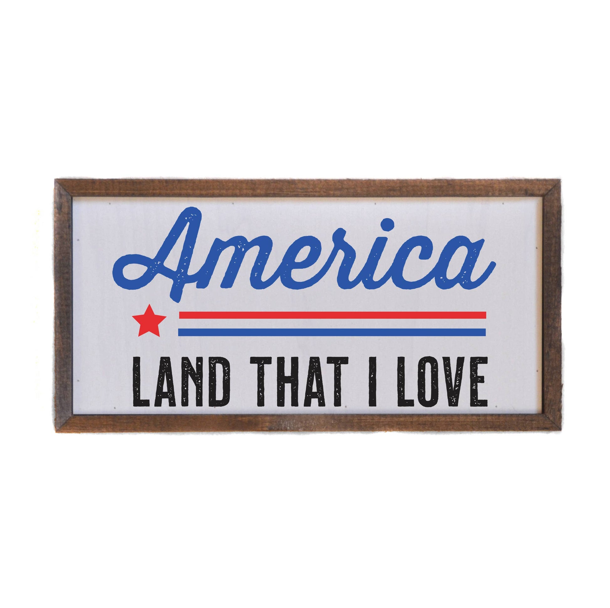 12x6 America Land That I Love Wall Sign or Desk Sitter. Built into a wooden box frame with a rustic touch.