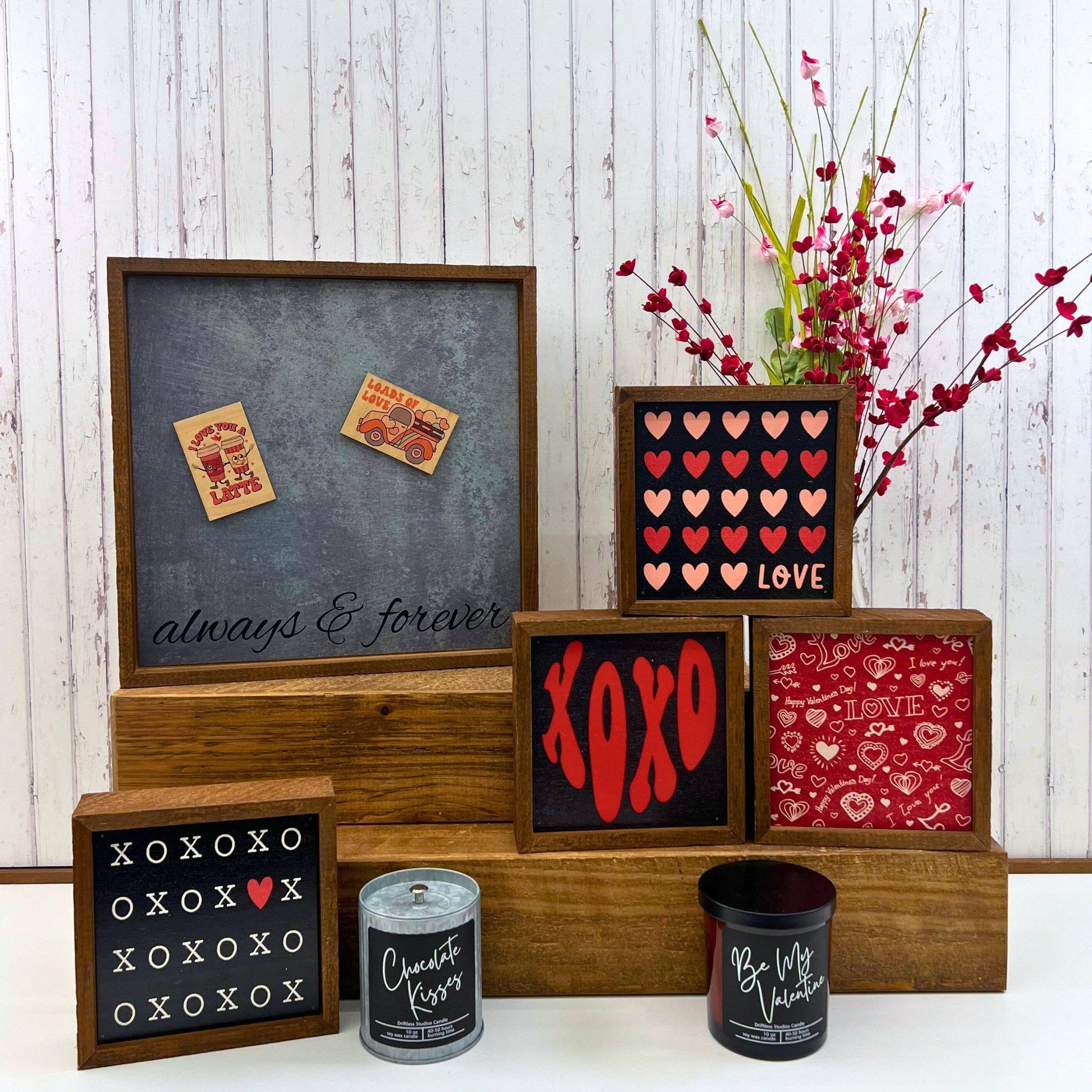 Love "Hearts" Valentines Day. All our signs are build into a wooden box frame with a rustic touch. We strive to mix the perfect blend of rustic and modern styles that will last for years. All of our signs can be easily hung directly off of the frame or will stand upright on shelves or desks.