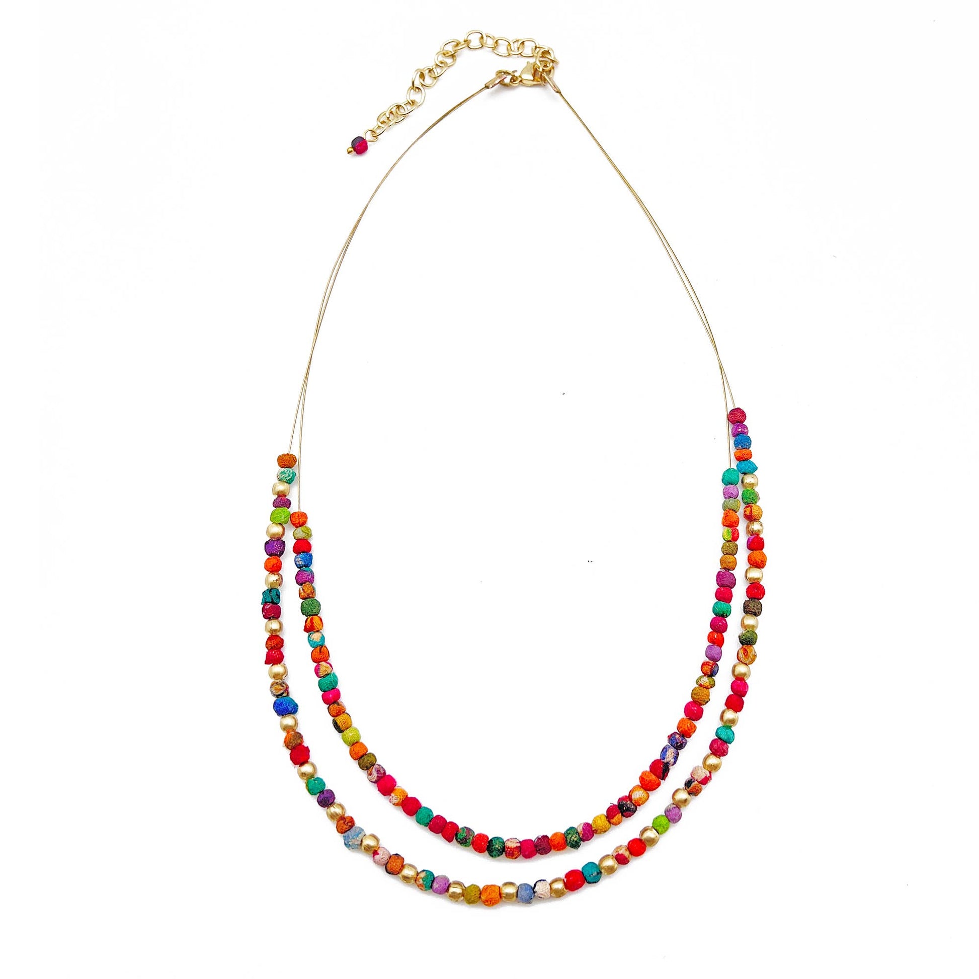 "Aasha" means hope in Hindi. Aasha is a 100% sustainable jewelry line made by an artisan group of economically disadvantaged women. Using discarded saris and wrapping them over small wooden beads these women are able to create a very unique and colorful collection of jewelry. The wooden beads are scraps sourced from furniture factories nearby, and the fabric used to cover them comes from old, worn saris, collected all over India! No two beads will be the same.