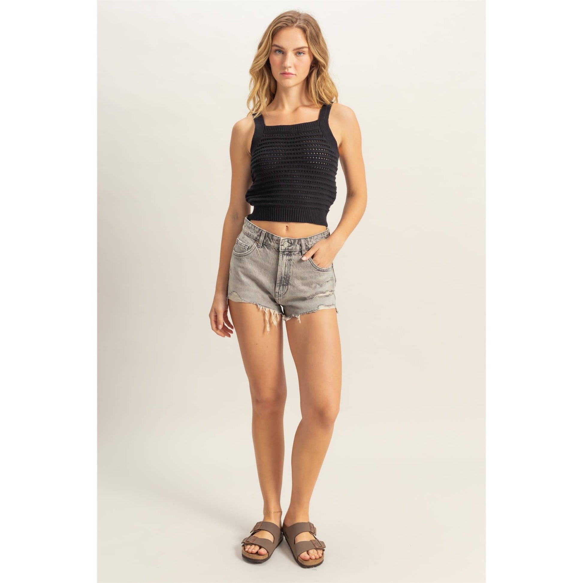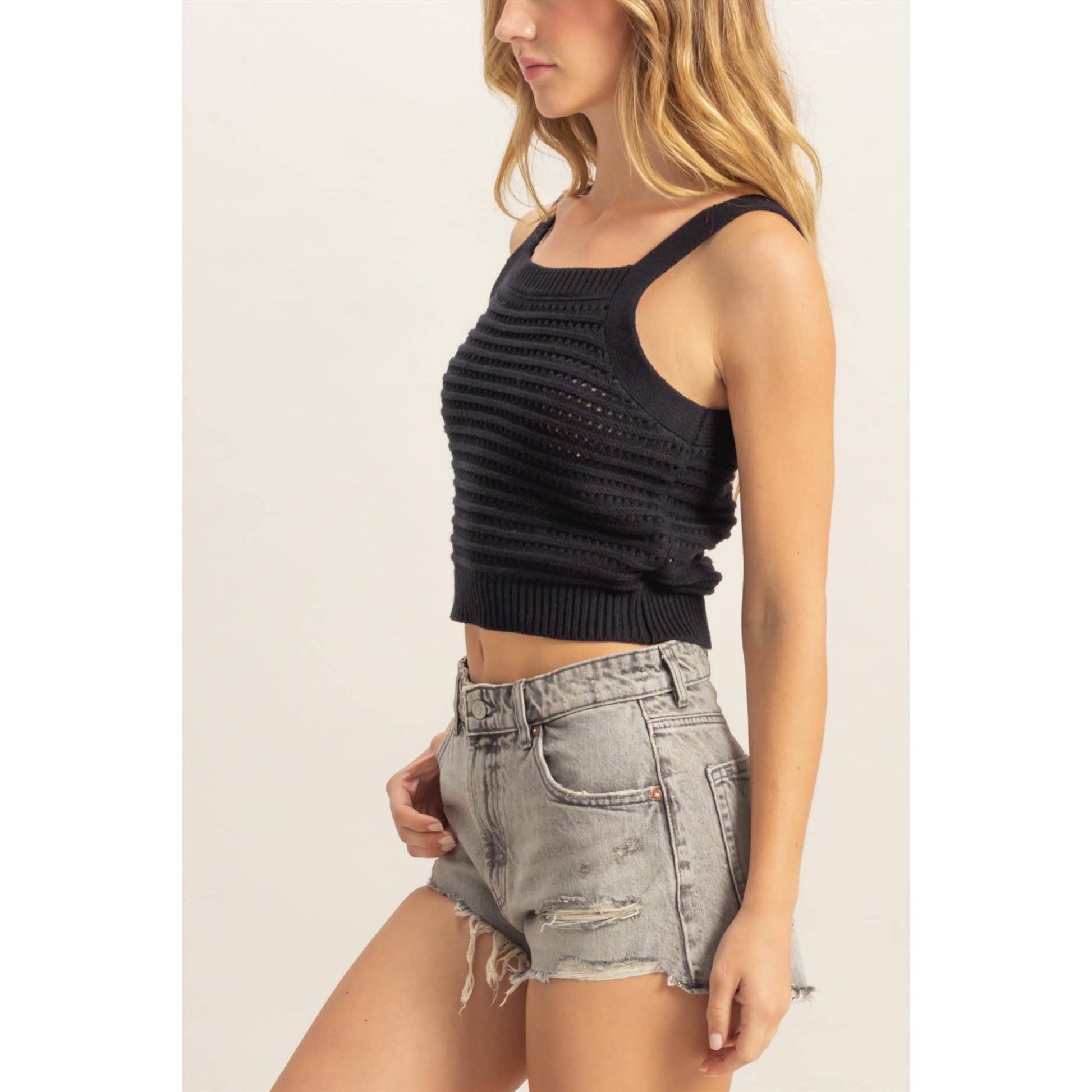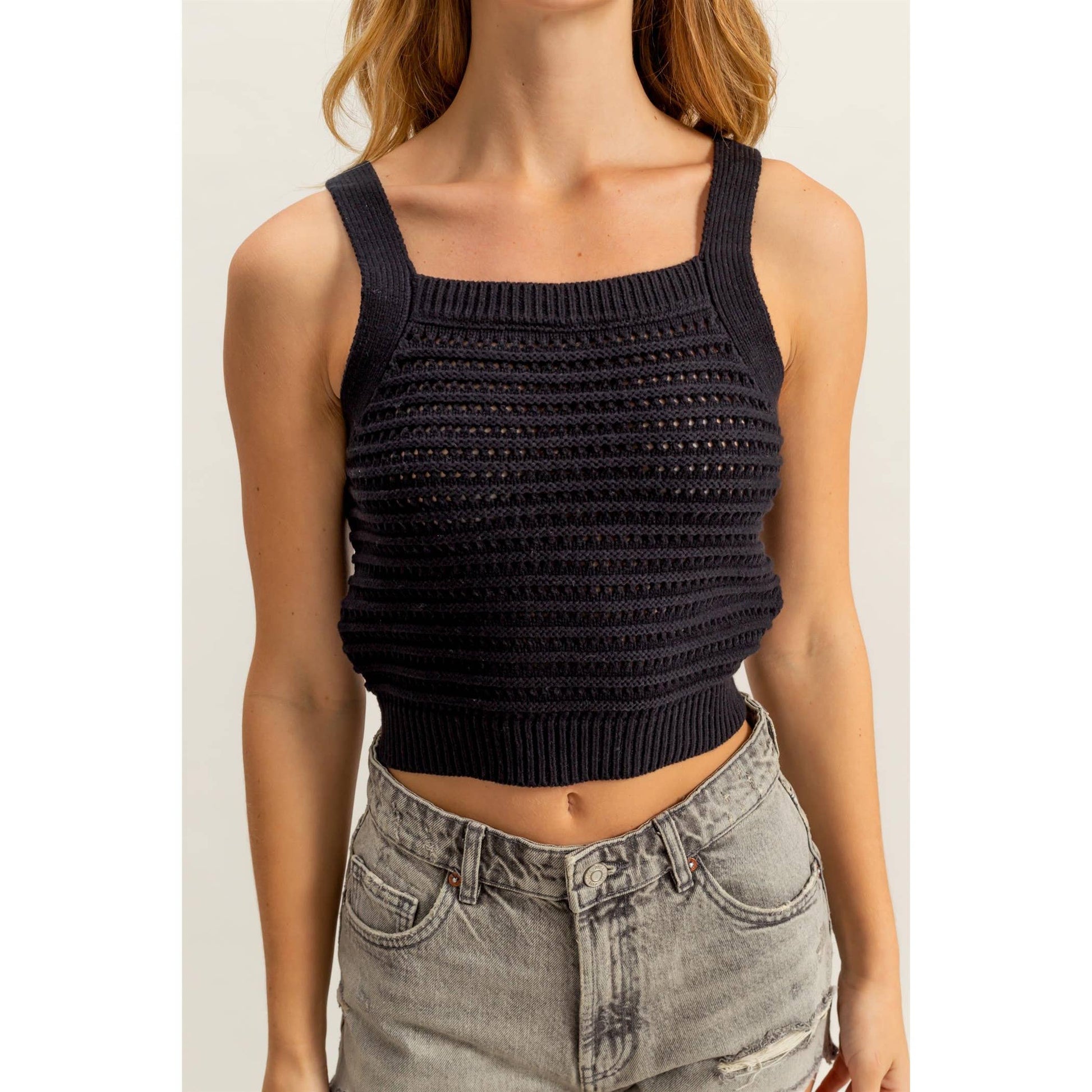 Heat The Town In The Sun Wearing This Fun Little knit Tank. Featuring A Knit Construction, This Top Comes With A Trendy Square Neckline And Thick Shoulder Straps. The Bodice Offers A Sleeveless And Snug Fit.