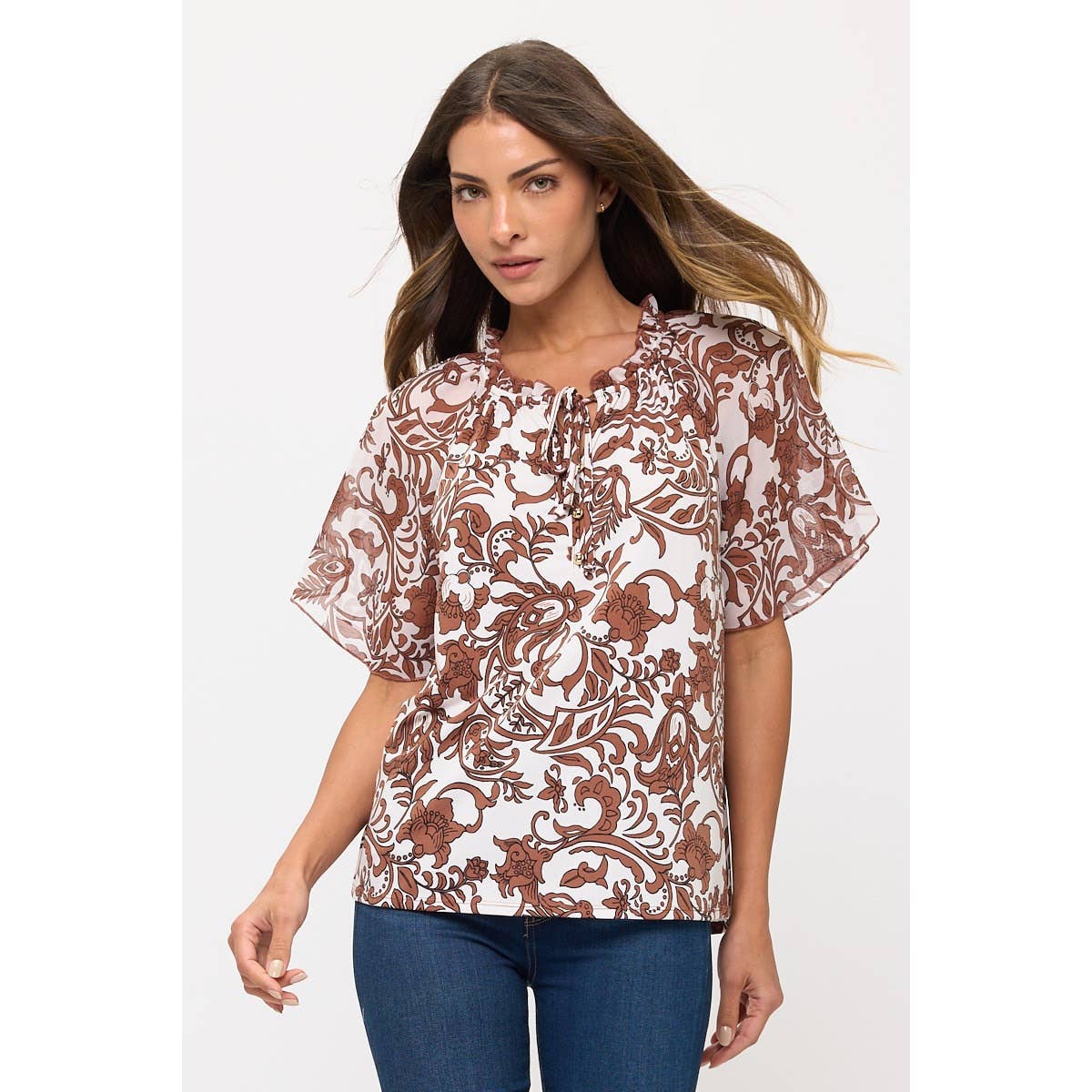 Floral ivory and brown ruffle accent top. Sheer sleeves - Mini Ruffle neckline - Button front - Tie Neck - Regular fit.