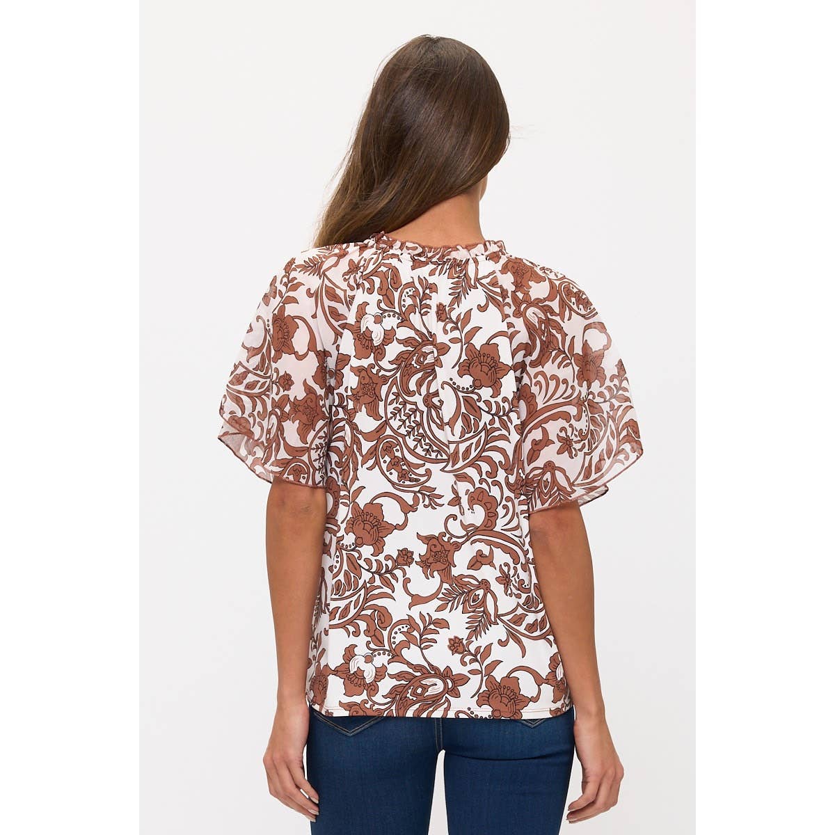 Floral ivory and brown ruffle accent top