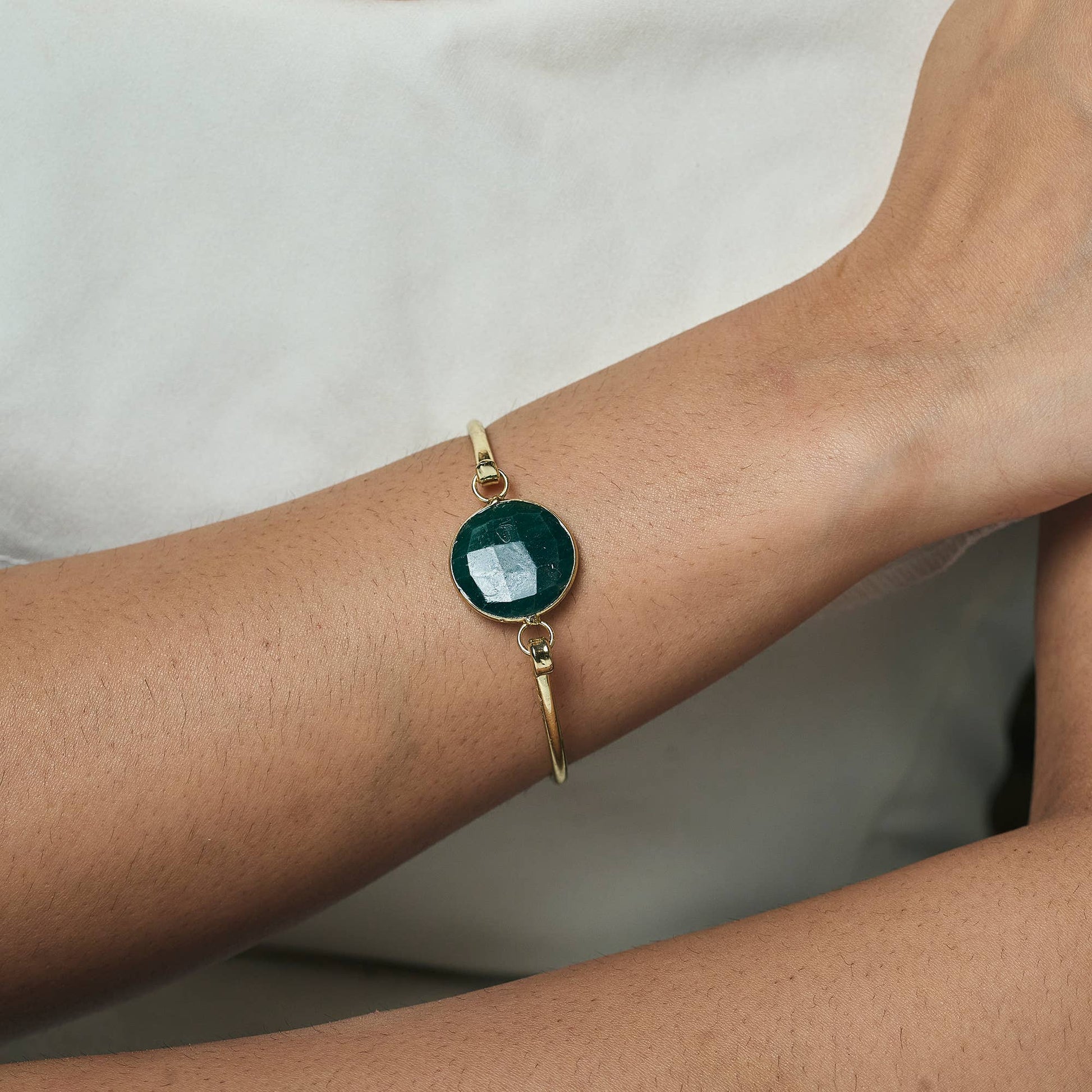 Natural hand-cut Mica Green set on a gold-plated brass bangle with a quick-release clasp, crafted in India by skilled artisans whose jewelry-making tradition spans generations.