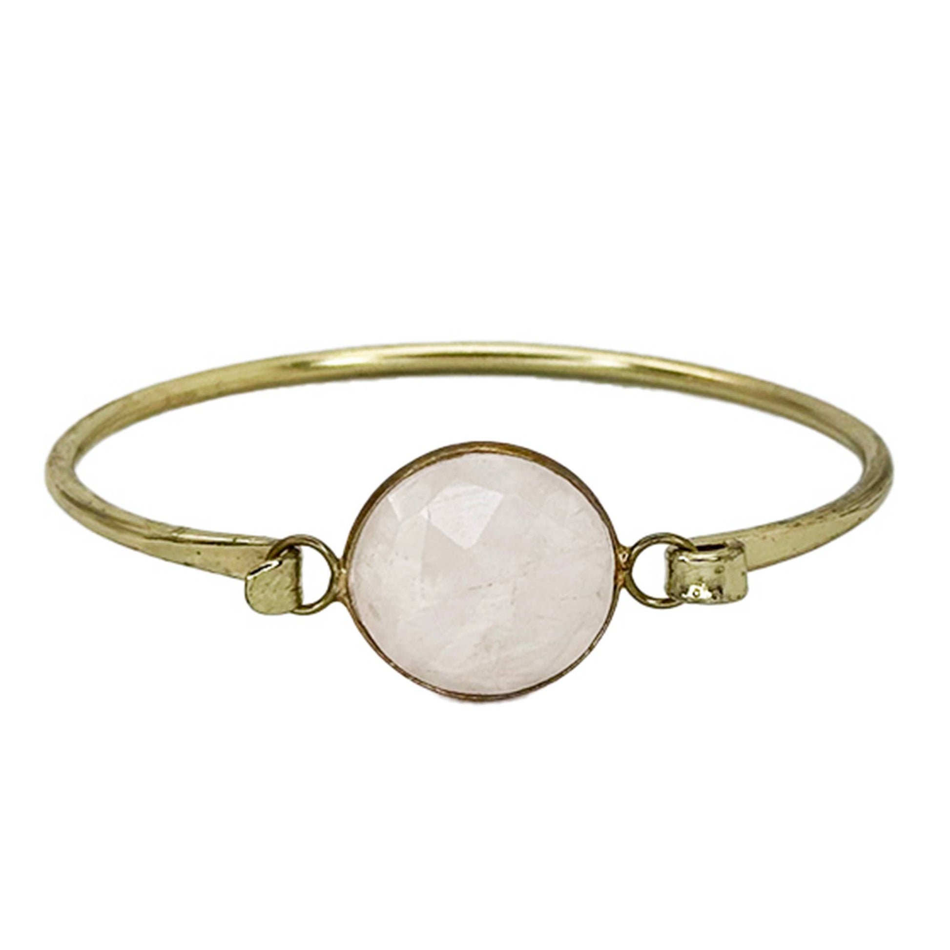 Natural hand-cut Rose Quartz set on a gold-plated brass bangle with a quick-release clasp, crafted in India by skilled artisans whose jewelry-making tradition spans generations.