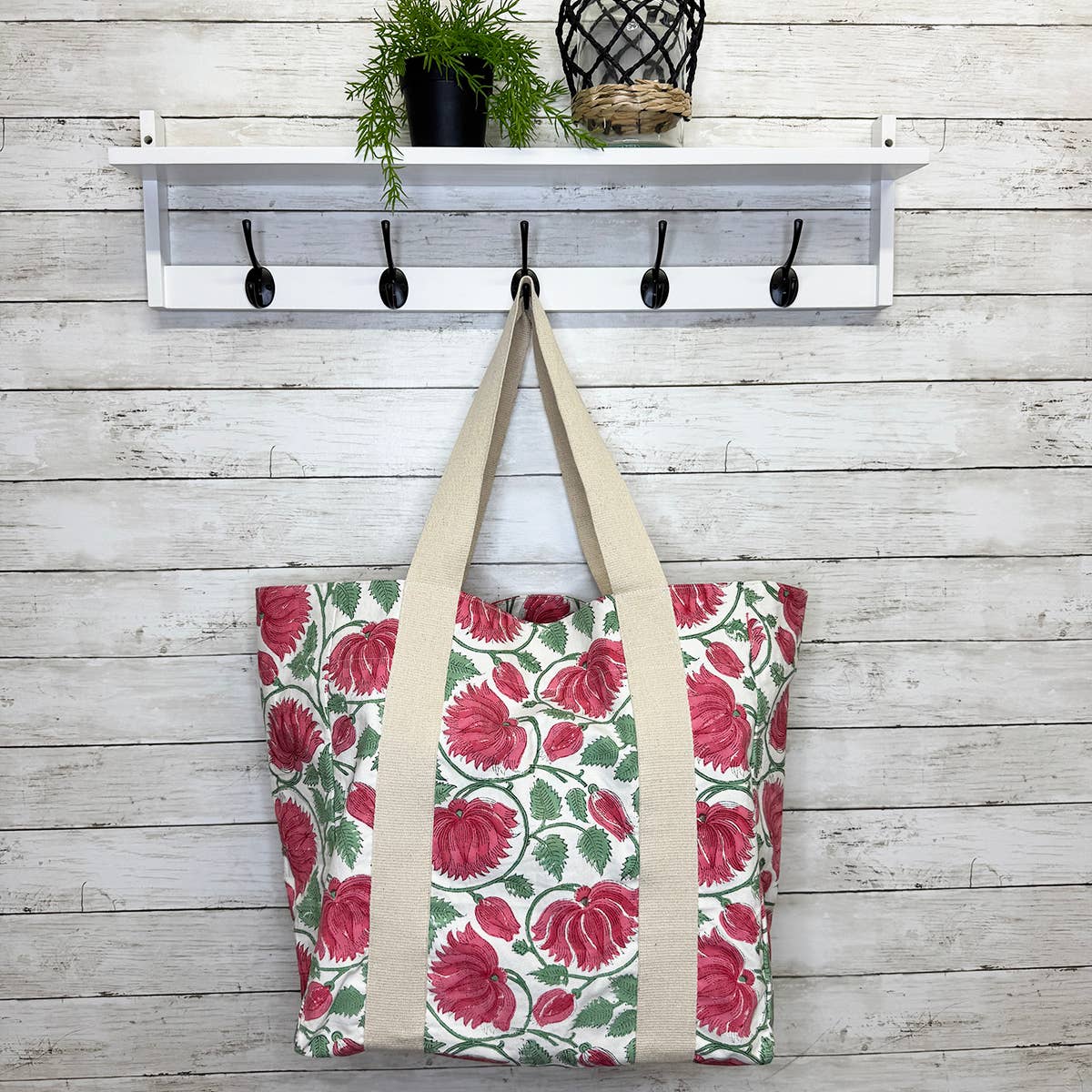 These spacious bags are crafted with durable canvas material and feature a block-printed soft cotton lining with two large pockets. With sturdy, comfortable, wide straps, it's ideal as a beach bag, everyday tote, or reusable shopping companion. With an elegant floral design of Strawberry Dalia, this nature-inspired tote is both stylish and functional. Generously sized at 18" x 15" x 7".
