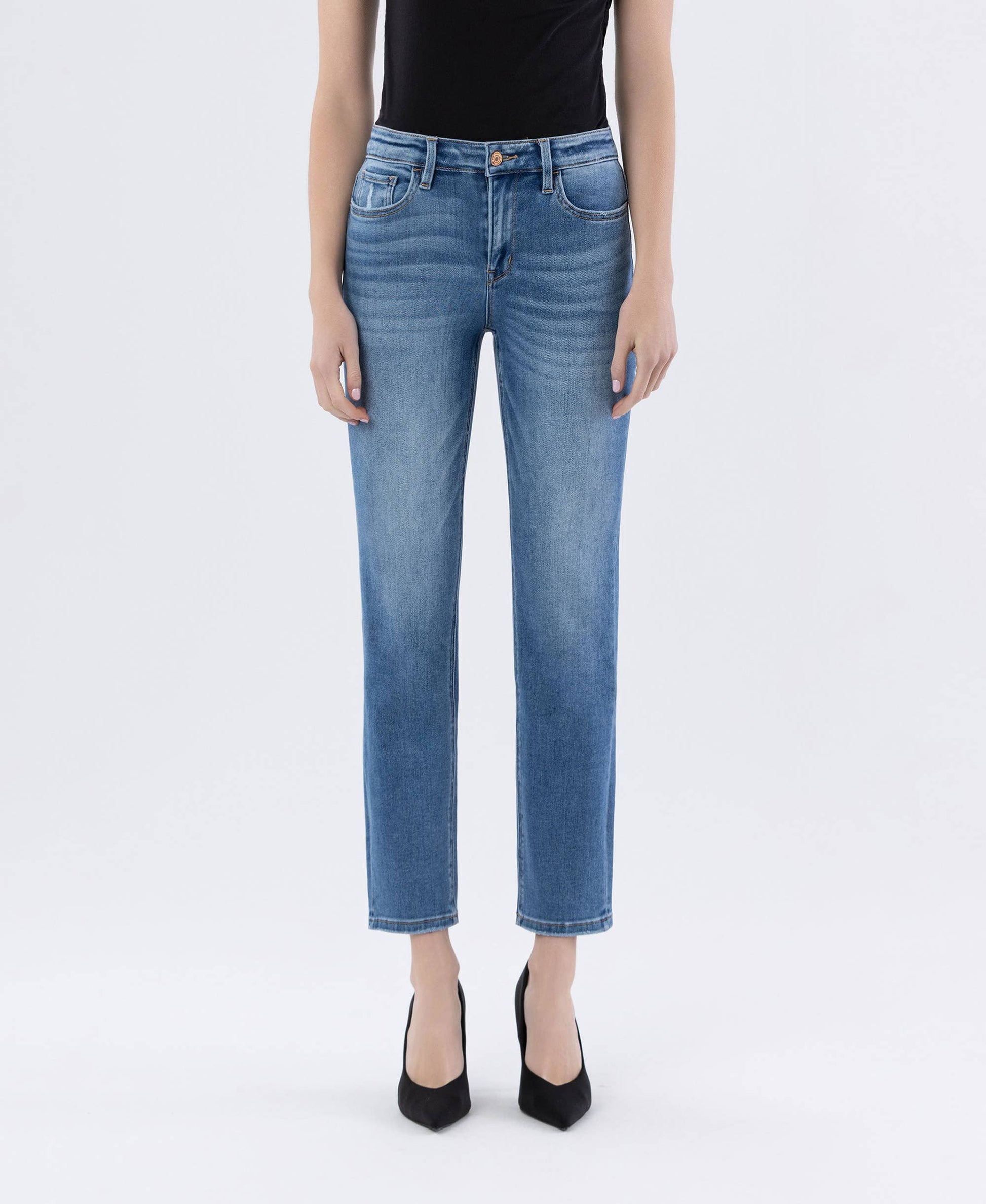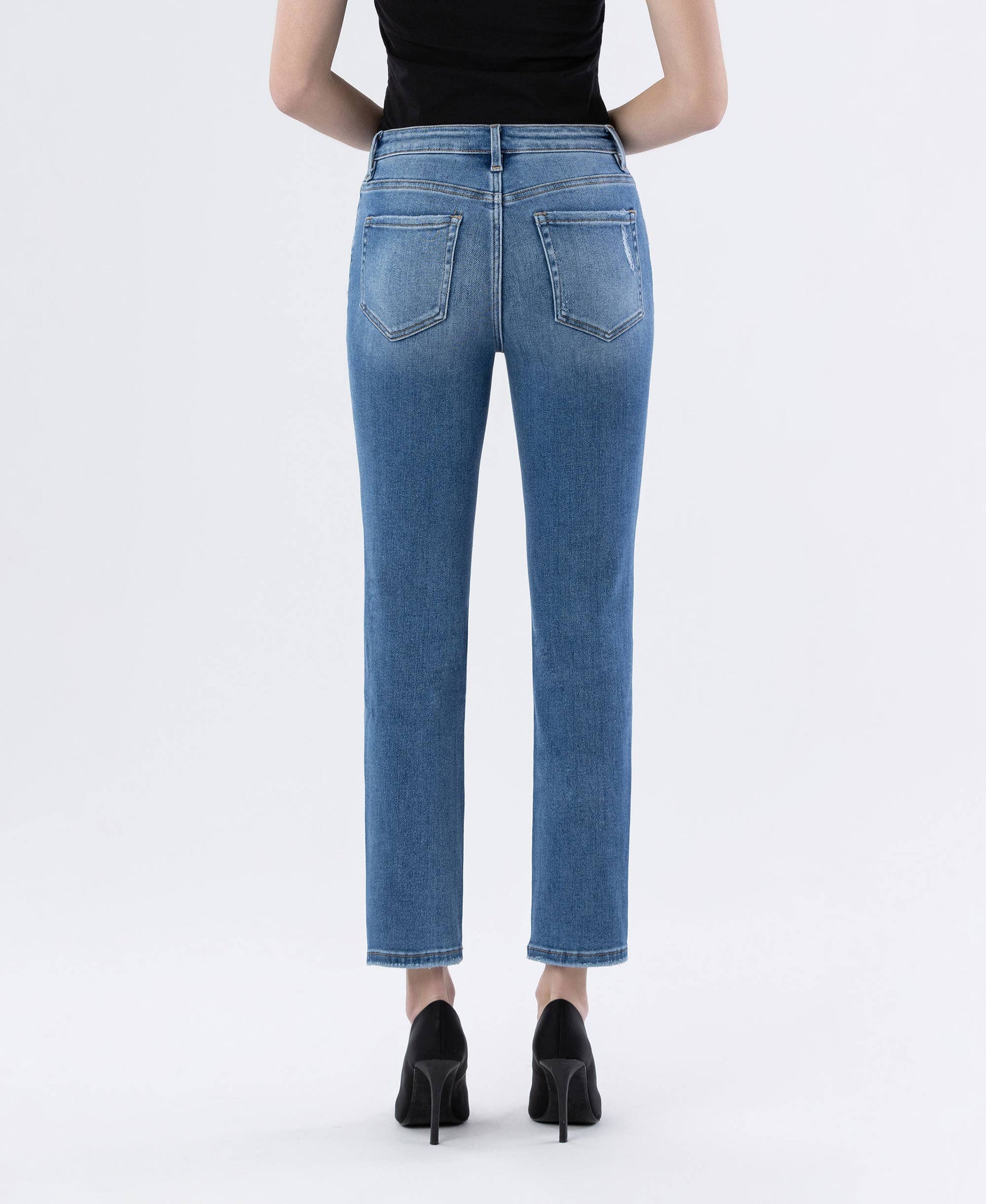 High rise, slim straight jeans. COMFORT STRETCH DENIM, HIGH RISE WAIST, SLIGHTLY DISTRESSED DETAIL, FINISHED HEM, ANKLE LENGTH, SLIM STRAIGHT JEANS.